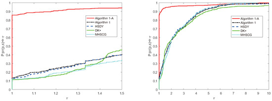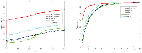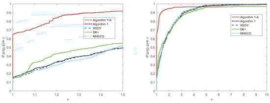 In order to present the performances of methods more intuitively, the tool in [40] is adopted to analyze the profiles of these methods. Robustness and efficiency rates are readable on the right and left vertical axes of the corresponding performance profiles, respectively. To present a detailed numerical comparison, two different scales have been considered for the -axis. One is , which shows what happens for the values of near to 1. The other is used to present the trend for large values of . In Figure 1, Figure 2 and Figure 3, we, respectively, show the performance of these methods relative to the number of iterations (), the number of function-gradient valuations (; which is the sum of the number of function valuations and gradient valuations), and the CPU time consumed in seconds.