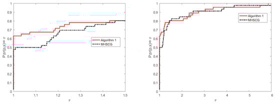 From Table 2 and Table 3, it can be found that for the dimensions from 5 to 50, Algorithm 1 and the MHSCG method successfully solve all of them and obtain reasonable optimal function values, which are all not greater than . For most problems, Algorithm 1 needed fewer iterations and function and gradient evaluations and obtained better optimal values. In order to show numerical performance intuitively, here we also adopt the performance profiles in [40] for the NI and NFG cases. The corresponding performance profiles are given in Figure 4 and Figure 5.