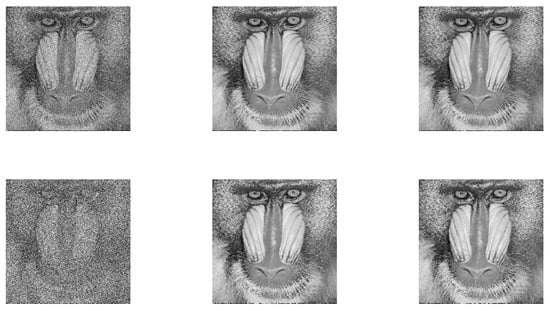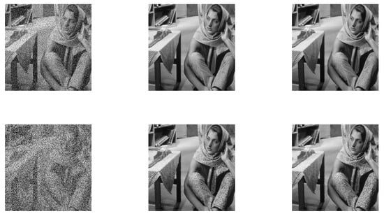 Meanwhile, to assess the restoration performance qualitatively, we also utilize the peak signal to noise ratio [45] (PSNR), which is defined by where M and N are the true image pixels, and and denote the pixel values of the restored image and the original image, respectively. For the noise level, we consider two cases: (a low-level case) and (a high-level case). The consumed CPU time and the corresponding PSNR values are given in Table 4. Meanwhile, the detailed performances are presented in Figure 6 and Figure 7, respectively.