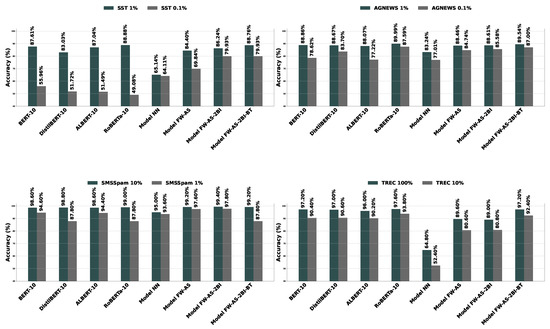 According to the experimental results in Section 4.2, the performance of existing approaches declines significantly as the training dataset size decreases. Figure 1 focuses on the two smallest training datasets from each of the four categories (SST, AGNEWS, SMSSpam, TREC). Four models represent existing approaches: BERT-10, DistilBERT-10, ALBERT-10, and RoBERTa-10. The remaining four models represent the proposed approaches: Model NN, Model FW-AS, Model FW-AS-2BI, and Model FW-AS-2BI-BT.
