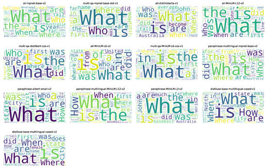 Word clouds illustrating the most influential words for generating embedding vectors from the first 100 sentences of the TREC test dataset, for each Sentence BERT bi-encoder.