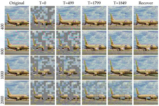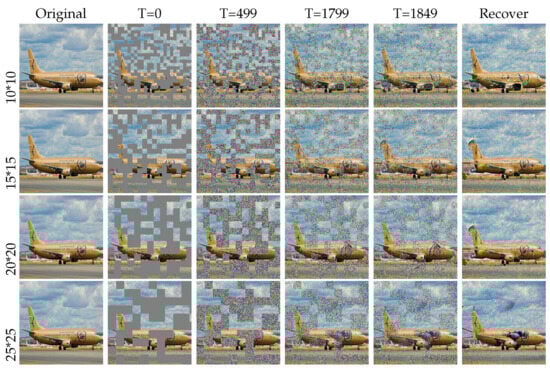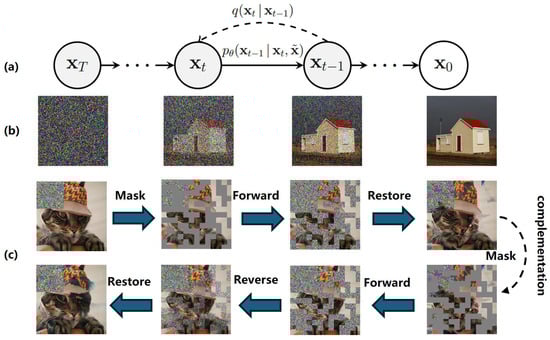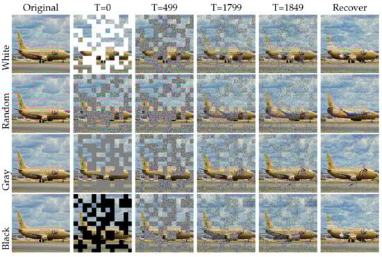 - Lugmayr, A.; Danelljan, M.; Romero, A.; Yu, F.; Timofte, R.; Van Gool, L. Repaint: Inpainting using denoising diffusion probabilistic models. In Proceedings of the IEEE/CVF Conference on Computer Vision and Pattern Recognition, New Orleans, LA, USA, 18–24 June 2022; IEEE: New York, NY, USA, 2022; pp. 11461–11471. [Google Scholar]