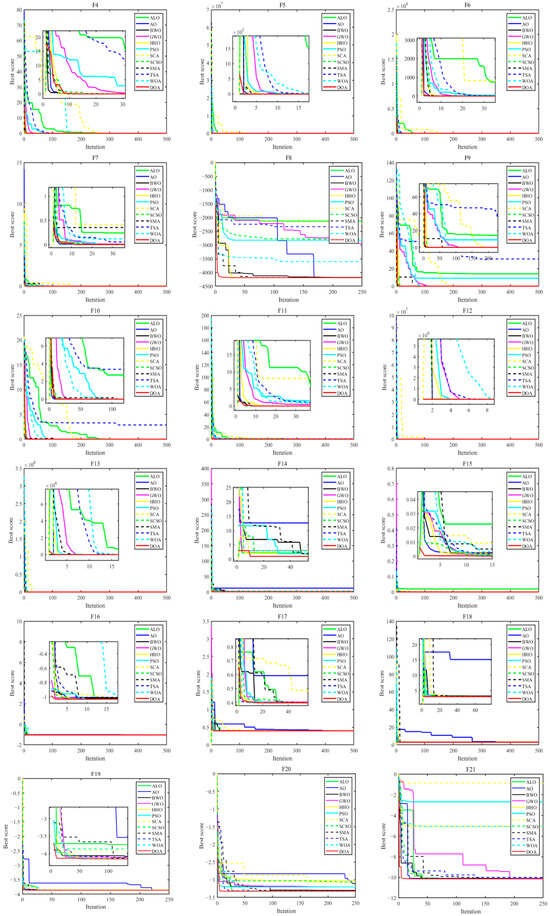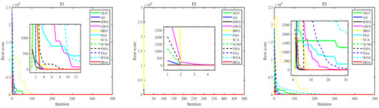 According to the results in the table, for the benchmark functions F1, F2, F4, F5, F6, F8, F9, F10, and F11, the running time of the DOA always ranks among the top three, and the optimal solution obtained by the DOA is significantly better than those of other algorithms. For the benchmark function F6, the DOA has the best running time of all algorithms, and its optimal solution is second only to PSO. On the benchmark function F12, the DOA’s runtime is second only to WOA, GWO, SCA, and TSA, but its optimal solution is better than those of all four algorithms.