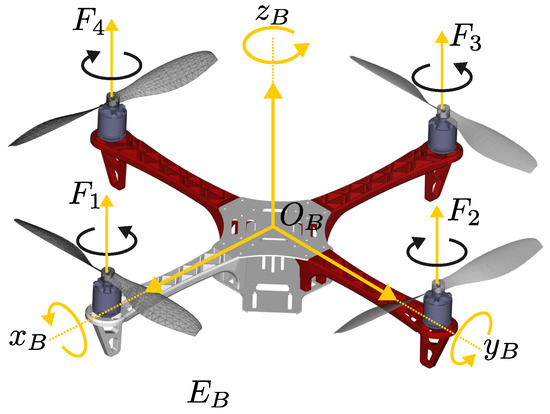 where d is the distance from the center of mass to the rotor shaft, c is the drag factor, is the rotor inertia, is the speed of the rotor i, is the aerodynamic function with , where the air density, is the aerodynamic coefficient, and is the element of , which is the velocity of the multicopter with respect to the air [30].