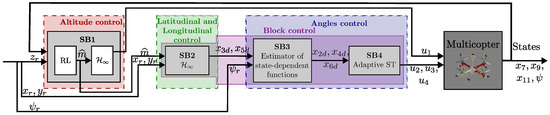 Hereafter, tracking is designed for altitude () with subblock through input , subsequently, for longitude () and latitude () control with subblock using the variables and , which are manipulated along with to track through , , and with subblocks and . Figure 2 shows the details of the proposed control.