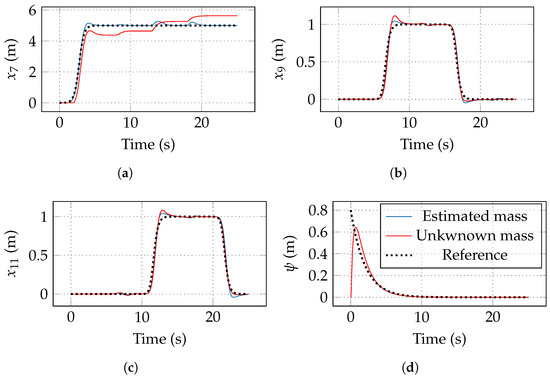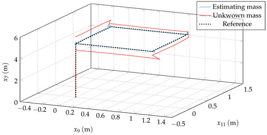 To demonstrate the effectiveness of the proposed control scheme, a hypothetical scenario is presented in which an aircraft with an initially unknown load travels through four points to unload part of it. For simulation purposes, a sequence of checkpoints i (), where are chosen as , , , , and meters at intervals of 4 s; each checkpoint is a set of reference . In the mass is released, and Table 1 shows the loads to be released.