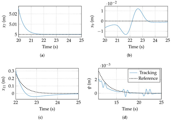 The control objective is to track a three-dimensional reference, , as well as the yaw angle reference, , with known derivatives. Adaptive backstepping [31], nonlinear– [32], and Sliding–Mode techniques [33] are combined to ensure trajectory tracking.