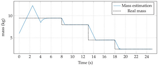 Estimation of the total mass using the Discontinuous Gradient algorithm is shown in Figure 6. In the first 8 s, the mass is the sum of all the loads and the nominal one, that is ; then, in , the resulting mass is the sum of all of them when is released, that is . Afterward, at time , the load of mass is released, and hence, the total mass is ; finally, when the quadrotor arrives to , at time , the mass is discharged, where the total mass equals m until the end of simulation. On the other hand, chattering in mass adaptation is not noticeable, thanks to the integral action in the finite-time mass estimation algorithm.