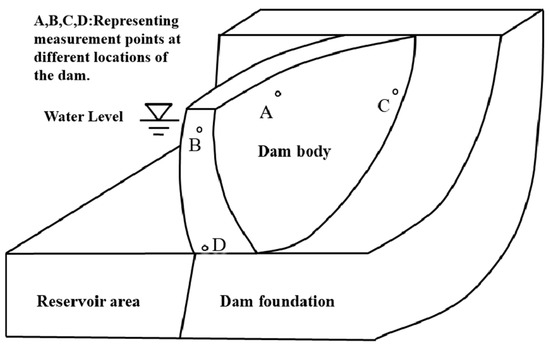 Figure 1), the deformations observed at measurement points A, B, C, and D are primarily influenced by common factors such as hydraulic pressure, temperature, and aging. However, the deformation patterns at points C and D, located near the dam foundation and bank slope, differ significantly from those at points A and B, which are situated near the dam crest. This variation is closely linked to the combined effects of structural constraints, material properties, and environmental conditions specific to different regions of the dam, resulting in distinct deformation behaviors. When the deformation analysis model fails to account for these complex, unmonitored, and unquantifiable factors, parameter heterogeneity arises. Although traditional deformation models can capture the primary influencing factors through independent variables, they often overlook the unique deformation characteristics at different measurement points caused by these complex influences. Given the intricate nature of arch dam structures, the deformations at various measurement points are interrelated. Therefore, by analyzing the internal correlations within the arch dam structure and integrating prototype monitoring data, the deformation behavior of the dam can be assessed using information fusion techniques. This approach helps to mitigate the impact of specific, non-monitored environmental factors on the deformations at different measurement points.