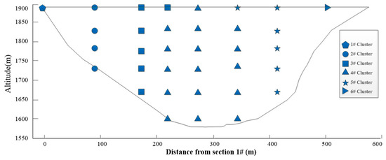 () can be calculated by Equation (4). When the difference between and is small while the difference between and is large, (the distance between the corresponding clusters) will be used as the threshold of the arch dam deformation clustering according to which the clustering cluster is determined.