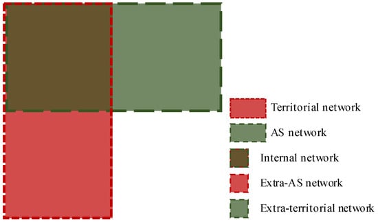 The relationship between a country’s AS and territorial networks is graphically represented in Figure 1. Within this framework, the territorial network is divided into an internal network and an extra-AS network, while the AS network consists of an internal network and an extra-territorial network. The intersection between the territorial network and the AS network forms the internal network, which includes routers that are geographically located within the country and owned by its AS. Conversely, the portion of the AS network that extends beyond the country’s geographical boundaries constitutes the extra-territorial network. Similarly, the portion of the foreign AS network that operates within the country’s territorial network is designated as the extra-AS network.