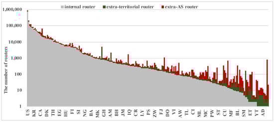 The classification of routers within our framework is as follows: routers common to both AS and territorial networks are classified as internal routers; those deployed by an AS network in foreign countries are termed extra-territorial routers; and routers within a territorial network belonging to foreign AS networks are identified as extra-AS routers. Figure 2 illustrates the distribution of these routers across countries, showcasing the sum of internal and extra-territorial routers as the total for AS networks, and the aggregate of internal and extra-AS routers as the total for territorial networks. The data are organized in descending order based on the count of internal routers, with one country represented for every six countries.