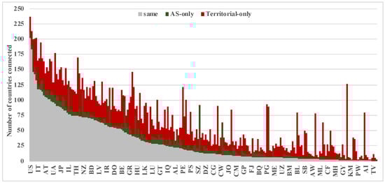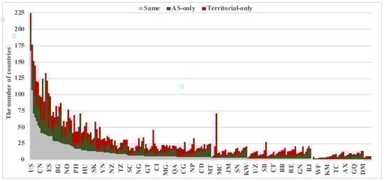 In our analysis, we explore the deployment patterns of AS and territorial networks across different countries as depicted in Figure 3. This figure differentiates between countries based on whether their AS networks deploy abroad (AS-only countries), their territorial networks host foreign deployments (territorial-only countries), or they exhibit a mix of both behaviors (same countries). The countries are ranked in descending order by the count of “same countries”, with each country represented every six countries on the horizontal axis for clarity.