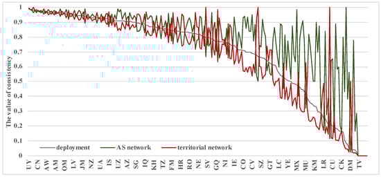 The deployment consistency within each country’s AS and territorial networks is critically analyzed and displayed in Figure 4, where countries are arranged in descending order based on their deployment consistency. The horizontal axis is structured to showcase one country for every six, facilitating a clearer comparison across a diverse set of nations.