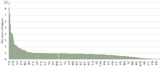 The impact scores of country-level AS networks on the Internet offer a compelling insight into the global distribution of digital influence. This analysis, visualized in Figure 5 and organized in descending order by impact score, with one country noted for every five, reveals the extent to which countries project their digital presence internationally through their AS networks. This projection is quantified based on the number of routers deployed by these networks across various countries.