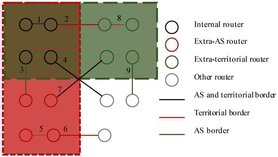 - Border Links : A subset of links, namely and , are unique in that they simultaneously serve as both AS border links and territorial border links, embodying the intersection of AS and territorial network boundaries.