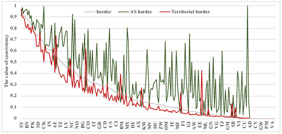 To evaluate the consistency of border connections across countries, we employ the Dice Similarity Coefficient, a method that quantifies the similarity between two sets. In the context of network analysis for a given country K, the border connection consistency, denoted as , measures the congruence between territorial network border links and AS network border links . This coefficient helps in assessing how closely the two sets of territorial border links and AS network border links overlap, with representing the intersection where both sets of border links coincide. The formula for calculating is based on the principle that a higher number of common border links between the AS network border links and the territorial network border links signifies greater consistency. Conversely, a proliferation of cross-border Autonomous Systems (ASes) that do not contribute to tends to lower the , indicating less congruence between the AS and territorial network borders: