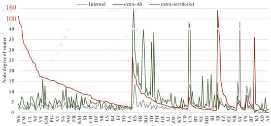 An outlier in the dataset is the Cook Islands, which, despite having only 13 routers, records an internal router node degree of 446 an extreme value that is excluded from the figure for clarity. Notably, four countries exhibit a node degree greater than 100: Iran and Samoa, with AS external router node degrees of 148 and 116, respectively, and Korea, with an external router node degree of 159. The average node degrees for internal, extra-AS, and extra-territorial routers across all countries stand at 3.2, 9.0, and 6.4, respectively. This categorization reveals that, in the majority of countries, internal routers typically have a smaller node degree compared to external routers, indicating a higher level of connectivity for routers involved in cross-network interactions.