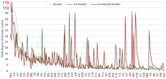 The analysis of the node degree for each country’s AS and territorial network borders, as depicted in Figure 11, offers a comprehensive view of the connectivity levels at the geographical boundaries of AS networks. This figure is organized in descending order by the node degree of border routers, with an emphasis on showcasing one country for every five along the horizontal axis for clarity and conciseness.