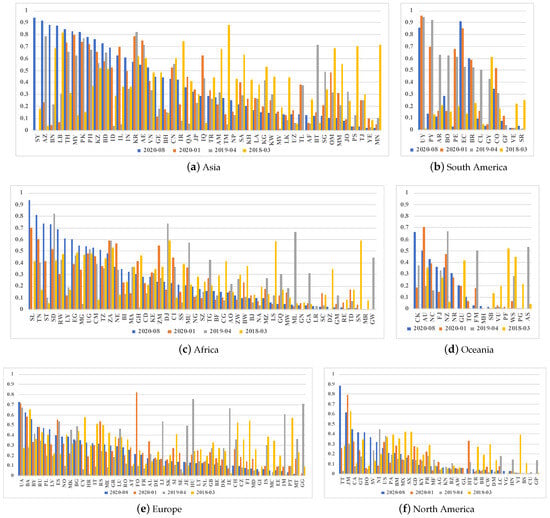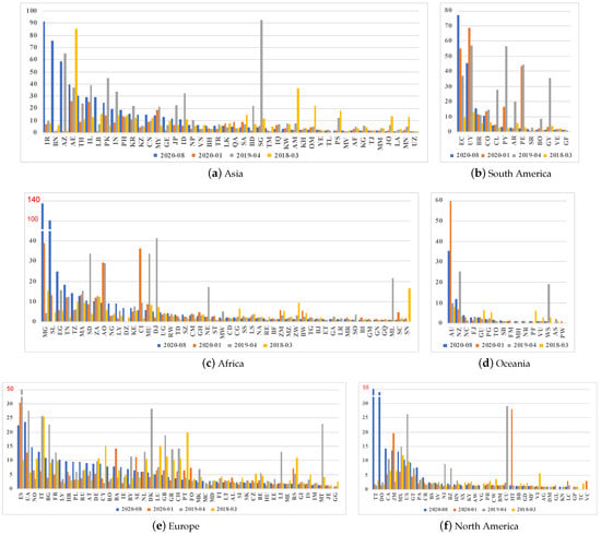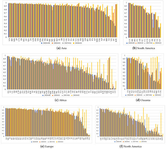 The analysis of border connection consistency between AS and territorial networks across continents highlights the dynamics of network infrastructure interconnectivity within countries. Figure 13 presents these data for August 2020, sorted in descending order of connection consistency, providing insights into regional trends and temporal shifts. A notable observation from the dataset is the significant deviation in March 2018 compared to other periods. This discrepancy is largely attributed to countries with substantial differences exhibiting fewer links in the raw data, suggesting a potential data bias for smaller networks. Over the analyzed periods, most countries in Asia, Africa, and North America record their highest connection consistency in March 2018, with a decline observed in April 2019. Conversely, South America shows a reverse trend, while Europe exhibits a gradual decrease over time, and Oceania does not follow a clear pattern.