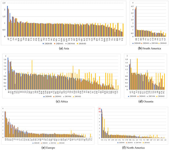The impact of each country’s AS network across continents reveals significant insights into their roles within the global internet architecture. Figure 14 showcases these impact scores for August 2020, arranged in descending order, to highlight regional trends and temporal dynamics. Over the observed periods, most Asian and African countries record their highest impact scores in March 2018, with a noticeable dip in April 2019, followed by a gradual increase. Conversely, Oceania’s impact scores decrease over time. Europe and South America, which see their lowest scores in March 2018, experience an increase thereafter, with minimal fluctuations in subsequent periods. North America presents a stark contrast between March 2018 and later periods, with only a few countries achieving high impact scores.