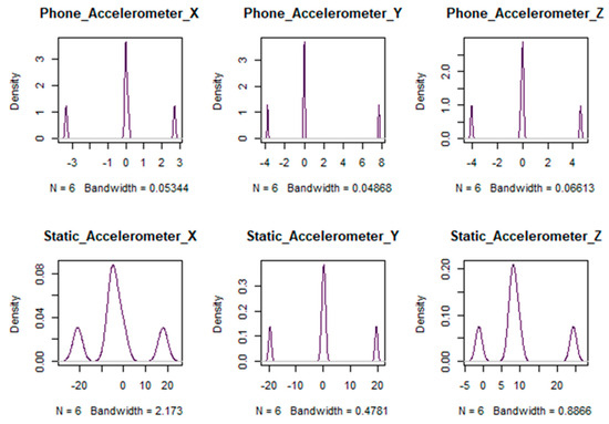 This comprehensive approach allowed us to compare our model against existing benchmarks and showcase its predictive performance and interpretability in the context of a categorical and continuous forecasting choice problem using real-world activity recognition data. The initial dataset comprises a total of 10.48576 observations. Subsequently, this dataset has undergone a division into distinct training and test sets, resulting in 713,031 observations for the training set and 335,545 observations for the test set. The delineation of these sets is integral for evaluating and validating our proposed model. Concerning the input feature sets for the proposed model, X is identified as the container for continuous variables, as delineated in Table 1. Meanwhile, the complementary six variables collectively constitute Y, a feature set embodying categorical attributes. This categorical feature set is strategically directed to the embedding layer in model architectures. The summary of this dataset is presented in Table 2, and the visual illustration of this accelerometer is presented in Figure 4, Figure 5 and Figure 6. Figure 4 illustrates the phone accelerometer readings along the x-, y-, and z-axes, showcasing how the accelerometer captures movement in three-dimensional space. Figure 5 shows static accelerometer readings along the same axes, highlighting variations in the sensor when in a stationary position. Figure 6 presents a comparative visual of the phone accelerometer readings across the x-, y-, and z-axes, providing an integrated view of movement data.