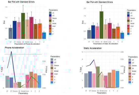 In this section, the experiment results are discussed in detail. In Table 4, the parameters for Acceleration-Time (AT) and Creation-Time (CT) exhibit notable values, with associated weights and biases influencing the model’s predictions. The X-, Y-, and Z-axes contribute to the model with specific weights, showcasing the importance of spatial orientations in the recognition process. Higher weights suggest stronger influences on the model’s decision-making. Categorical variables such as User, Model, Device, and Gestures (gt) have associated parameters that capture their impact on the model. The attention mechanism and embedded weights allow the model to learn intricate patterns within these categorical features. Parameters associated with static accelerometer samples, particularly Z (Phone orientation), reveal significant values. This suggests that the phone’s orientation during static instances plays a crucial role in activity recognition. p-values provide insight into the statistical significance of each parameter estimate. Smaller p-values, such as those for Gt and Static Z, indicate stronger evidence against the null hypothesis, suggesting a more significant impact on the model. The attention weights associated with continuous inputs, including AT, CT, X, Y, and Static Z, highlight the model’s focus on specific instances or orientations. The visual illustration of these estimates is shown in Figure 8.