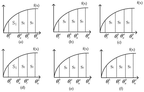 where f(x) is an attitude function defined on (0, +∞) that reflects the decision maker’s attitude toward alternative options. When the interval relationships are as shown in Figure 3d–f, the above formula can be referenced, and individual explanations are no longer provided.