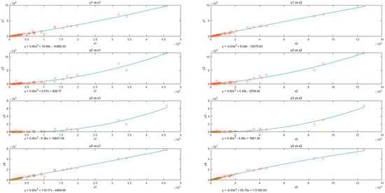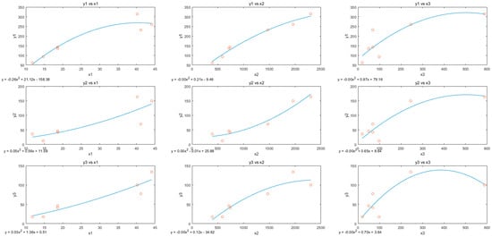Based on the known efficiency intervals, it was necessary to rank the different efficiency intervals to better reflect the differences in potential efficiencies between the DMUs. Using the improved possibility algorithm proposed in this paper to rank the interval efficiencies, the fitting of different outputs relative to inputs is illustrated in Figure 9.