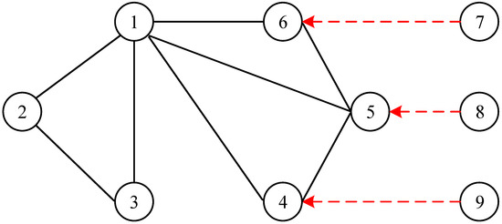 The communication graph is given in Figure 1, in which satisfies Assumption 1. Then, the matrices and are as follows: