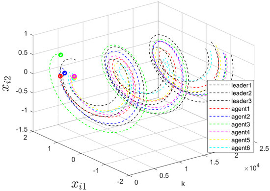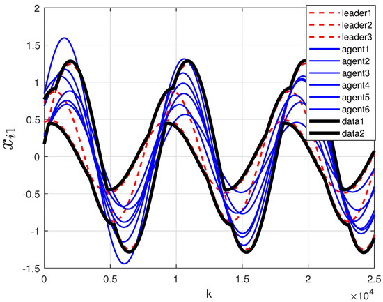 Through Figure 2 and Figure 3, we can obtain the convex hull of all followers’ states converging to the respective leader’s states, where the real line represents the follower’s trajectory, the imaginary line represents the leader’s trajectory, and the black rough line represents the convex hull of the leader’s trajectory.
