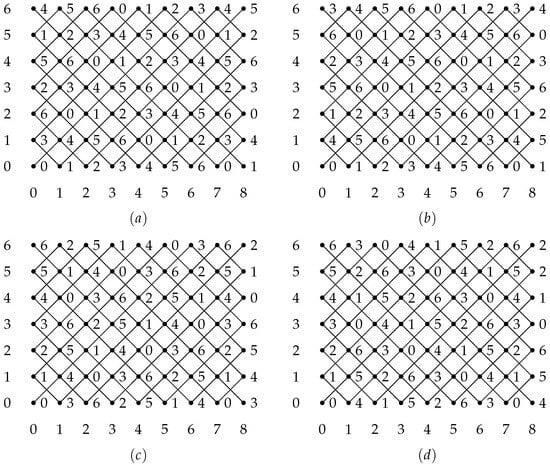 - Let us first observe two adjacent vertices v and w. Let X have the labeling and let . Then, w is of the form , where for some . Vertex v can be assigned the integerand w can be assigned the integerWe claim that or, through Corollary 1, thatSince there exists such that , it follows that(since equals s for and for ). Using Corollary 2, this can be shown to be equal to d or to and the claim is true.Further, observe labeling . Then, one of the statements—(b), (c) or (d)—of the Theorem applies. Let these be Cases (b), (c) and (d), accordingly. Sinceandin all three cases we have to show thatusing Corollary 1.Case (b) Let (then ). Since for some , we can obtainUsing Corollary 2, this is shown to be equal to .Case (c) Let (then ). Since for some , it holds thatAs in case (a), this is equal to or .Case (d) Let (then ). Since for some , it holds thatFor , we can obtainand for , we can obtainThe desired result follows, since, in this case, we can also obtain or .