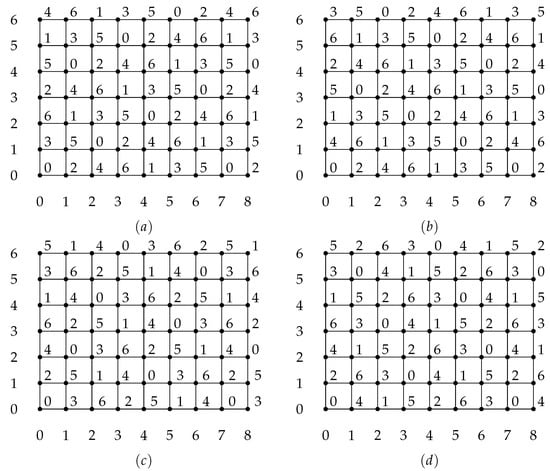 Four -labelings of that determined -labelings of Cartesian graph bundle according to the cyclic ℓ-shift : (a) , (b) , (c) , (d) .