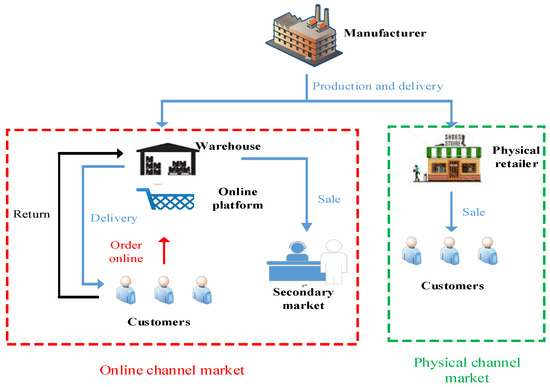 During the manufacturing process, defective products may arise due to imperfect production systems, old equipment, or human negligence. Therefore, inventory models with imperfect production systems and defective products have been widely proposed [25,26,27,28]. At the earliest, Porteus [29] considered that the quantity of defective products in a production batch is related to the probability of process out of control, and treated the quality level as a decision variable to explore the investment required to improve the production process. Keller and Noori [30] then extended Porteus’s model to include inventory systems with shortages and stochastic demand lead time. Hong and Hayya [31] further generalized Porteus’s approach by incorporating budget constraints and investigating the economic benefits of reducing setup costs and process improvements. Salameh and Jaber [32] introduced the concept of selling defective items at a discounted price after full inspection at the end of a cycle. Subsequently, the inventory model with defective items began to be widely discussed. For instance, Huang [33] developed an integrated inventory model considering defective items from a supply chain perspective. Sana [34] introduced rework concepts to explore inventory models with defective items. Ouyang et al. [35] developed an EOQ model with defective items considering partial delayed payments. Vishkaei et al. [36] investigated optimal replenishment strategies involving inspection and return of defective items. Chen et al. [37] studied the impact of product warranty periods on selling prices. Taleizadeh et al. [38] proposed an inventory model considering defective items and partial backorders. Khalilpourazari and Pasandideh [39] developed a dual-objective Economic Production Quantity (EPQ) model with the stochastic defective rate and allowed shortages. Barzegar and Sajadieh [27] extended Huang’s [33] concept by considering investments to improve defective rates. Priyan and Manivannan [40] explored inventory models with fuzzy deteriorating rates and inspection errors. Nobil et al. [41] addressed procurement-production-inventory problems, considering an imperfect production system under both shortage and non-shortage scenarios. Tiwari et al. [42] developed a stochastic supply chain model in which quality issues and inspection errors impact integration. Zahedi et al. [43] designed a closed loop supply chain system, including forward supply, production, and distribution, as well as reverse inspection, recovery, and disposal. They proposed an integrated objective function to maximize the total profit of the entire supply chain. Because the manufacturer entrusted by the brand owner may produce defective products, in terms of physical channel sales, the defective products produced are not recycled and are directly entrusted to retailers for processing. In the online channel, since the platform allows customers to return goods within a period of time, the returned goods seek to be sold in the secondary market at low prices.
