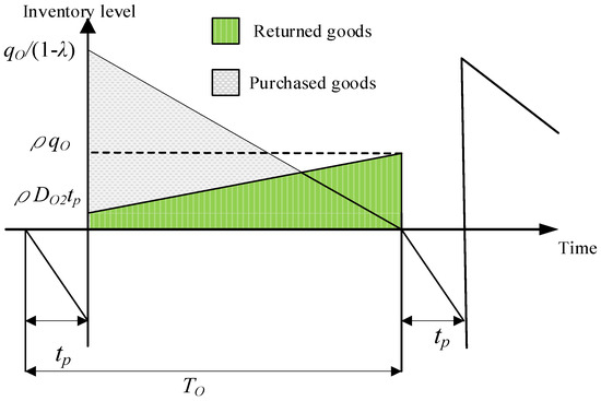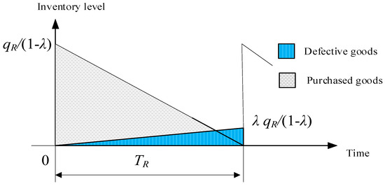 For the physical channel retailer, it orders from the manufacturer each time and requires shipments; that is, the quantity of is shipped each replenishment cycle with the length of . Since each batch of finished products will contain defective items with the defect rate λ, a quantity of will be shipped to the physical retailer each time. The inventory level of each replenishment cycle gradually decreases based on market demand, as shown in Figure 2. All the defective items are discarded at the end of each replenishment cycle for the physical retail channel.