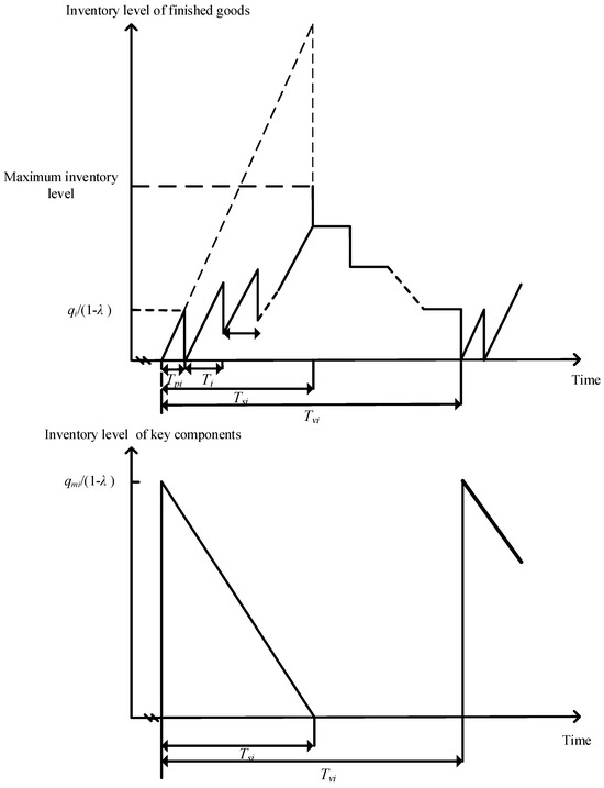 Based on the aforementioned symbol definitions and assumptions, it can calculate the manufacturer’s total profit per unit of time, which includes sales revenue, setup cost, ordering cost of key components, production cost, purchasing cost of key components, and holding cost, detailed as follows: