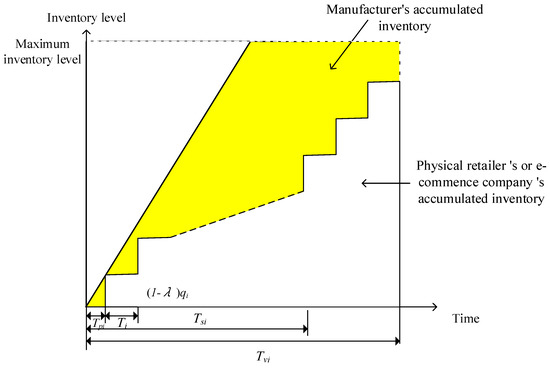 - Holding Cost: The holding cost for the manufacturer includes two parts: key components and finished goods. Firstly, the inventory level changes for the manufacturer’s key components across different retail channels are as shown in Figure 4. Hence, the total inventory cost of key components is . As for the holding cost of finished goods, since the manufacturer’s cumulative inventory for each production cycle is equal to its cumulative inventory minus the physical retailer’s or the e-commerce company’s cumulative inventory, as shown in Figure 5, the total cumulative inventory of finished goods for the two channels is calculated as: