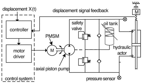 The fault diagnosis problem of this study was connected with the leakage issue of the hydraulic cylinder inside the EHA. Structured with a hydraulic system approach, a typical EHA includes a closed-loop vector-controlled permanent magnet synchronous motor (PMSM), one oil tank, one axial piston pump, one EHA pump, one hydraulic actuator, and the associated charging circuits (Figure 3) [29].