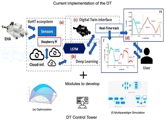 The cloud-based infrastructure in this study was designed by using AWS components and adapting them to the IIoT approach connected through the sensors and the related software infrastructure, which was coded via Phyton 3.12 programming language. Through the data stored in the cloud infrastructure, a general user interface where users can track the EHA working in real time and obtain predictive fault diagnosis signs was created accordingly. This interface leads to the information of the digital twin in the developed IIoT system. In order to ensure a better user experience (UX) facility, a representative scheme of the EHA was provided, with buttons to view the ongoing signals of the control parameters. These buttons lead users to real-time data flow (in terms of specific EHA parameters) and the signals of outputs (also LSTM outputs) associated with and s. Thanks to the LSTM predictions, four different states are shown through graphics: (1) Green: normal state, (2) Blue: minor fault state, (3) Orange: medium fault state, and (4) Red: major fault state. All the graphics are refreshed in real time to ensure the digital twin connection. Figure 4 provides the general digital twin IIoT approach (cloud, connections, etc.), LSTM structure, and the digital twin-driven user interface. Faulty states are relayed to the user side with some warming signs through the same and graphics. Figure 4 shows the design of the DT, considering the stages implemented so far and the missing optimization and simulation modules. The current implementation allows identifying the outputs generated with the status of the operation in real time for the direct user.