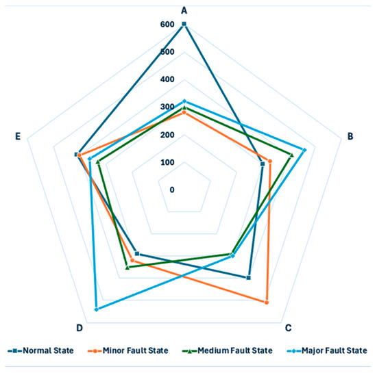 For each data set of the EHA, different numbers of samples for four different states were considered. At this point, each data set included a total of 1500 samples. Since it was reported by [29] that better results for EHA fault diagnosis were obtained with the existence of a pressure difference , predicted motor current , and predicted rotation speed , the data sets included them. In this context, two of data sets were created with the values of pressure difference , velocity , motor current , and rotation speed . In addition to these values/parameters, three remaining data sets also included predicted motor current and predicted rotation speed . Figure 5 provides information about five different data sets used for training–testing the LSTM model. Each data set is labeled with a uppercase letter and has a different distribution of the four state classes. Parameters included in the data sets also differ, as was mentioned under the previous section.