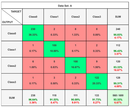 LSTM model results (Data Set A). The green color corresponds to a correct classification and the red color to a classification in the incorrect category.
