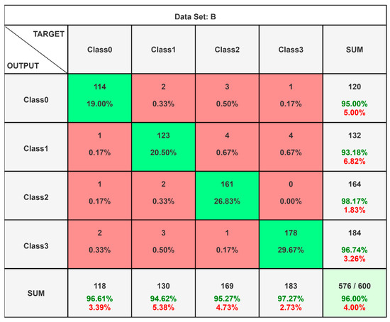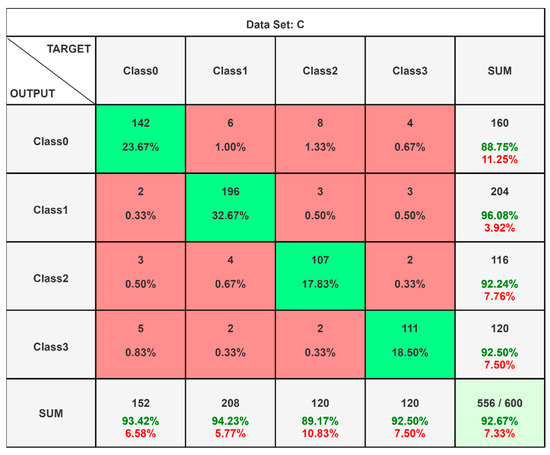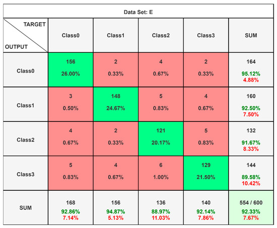 After creating and configuring the data sets, the LSTM model was run through a hyperparameter optimization process using a grid search approach. From this, the training parameters selected were as follows: (1) 300 epochs, (2) using the Adam Optimizer algorithm, (3) learning rate was reduced with the initial value of 0.004, (4) the random seed was taken as 10, (5) the LSTM architecture had an input layer, one hidden layer with 100 cells, one hidden layer with 80 cells, and an output layer, and (6) ReLU activation function. For the data sets, 60% of the samples were used for training while the remaining 40% were for testing. To check the stability, a training test was performed 50 times, and the average findings were considered for evaluation. Whenever the LSTM results were accepted across the four different state classes, well-known classification metrics were employed to understand the overall results.