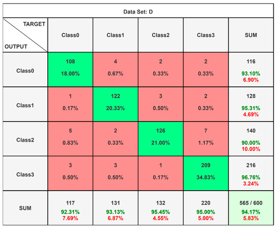 Once the LSTM training process was completed, the test findings for the 600 data samples were evaluated in terms of performance states. In terms of machine learning modeling, this is a classification model, as it seeks to classify by the level of failure expected in the system. Accuracy, precision, recall, and F1 score were used as result measures, for which confusion matrices were estimated for the databases used. The confusion matrices for the data sets are presented in Figure 6, Figure 7, Figure 8, Figure 9 and Figure 10.