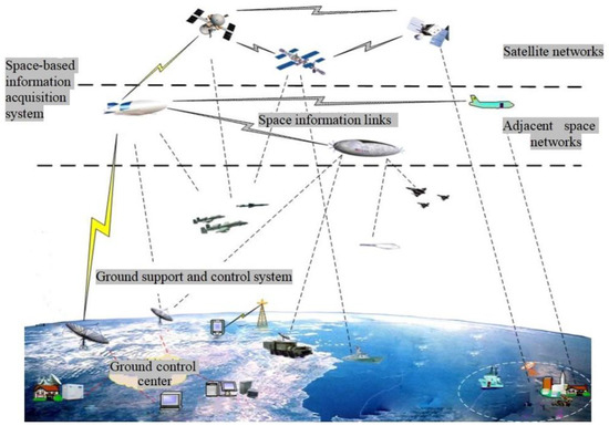 In the context of the global commercialization of 5G [1], traditional ground networks are facing exponential growth in terms of throughput, user access, and high-speed information transmission. However, due to their limited coverage and network capacity, an increasing number of communication tasks and sharp resource conflicts have made it more difficult to arrange tasks properly, which has led researchers to pay extensive attention to space information networks [2,3,4]. The connotation of space information networks changes with the development of space communication technology, and these networks have now evolved into integrated comprehensive information networks consisting of satellite networks, adjacent space networks, and related ground facilities [5]. In terms of functionality, the structure of space information networks mainly includes space-based information acquisition systems, space information links, and ground support and control systems, as shown in Figure 1. Among these, the space-based information acquisition system mainly consists of communication satellites, reconnaissance satellites, navigation satellites, near-space spacecraft, and some high-altitude reconnaissance aircraft and early warning aircraft, which form the dynamic node set of the space information network. The various information nodes are connected by relay systems and network devices to form space information links, connecting different levels of aircraft and ground systems in the space information network that perform different tasks. The ground support and control system consist of ground measurement and control systems, information processing systems, command and control systems, and other ground facilities. The ground control center is the only static node in the space information network, and it plays an important role in maintaining the normal operation of the network [6]. Space information networks are based on traditional ground networks, supplemented by air-based networks and space-based networks, and they provide information security infrastructure for various applications in wide-area space [7]. By integrating various resources, they promote the rapid development of applications such as the Internet of things and the Internet of vehicles. Space information networks are also seen as the most promising development direction for future 6G networks [8].