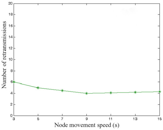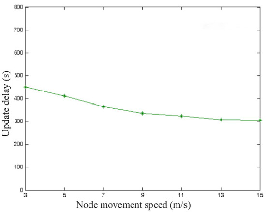 Keeping the network size unchanged, the impact of node movement speed changes as the performance of the scheme is examined. During the network operation phase, the variation of node private key update delay and the average number of re-transmissions of update requests are shown in Figure 4 and Figure 5, respectively. It can be seen that in the low-speed case, the update delay is larger, and the number of re-transmissions is slightly higher, which is caused by the nodes not being able to find the threshold DPKGs node in time at low speed. With the increase in mobile speed, the delay is gradually stabilized, and the average delay is about 300 s, which shows that the scheme in this paper exhibits stability.
