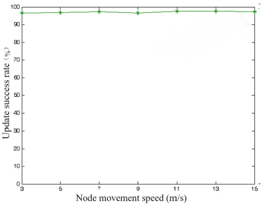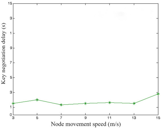 The node private update success rate is shown in Figure 6, which indicates that the change of speed has little effect on the node private key update success rate, which is close to 100%. The variation of session key negotiation delay is shown in Figure 7, from which it can be seen that the key negotiation delay basically converges around 1.5 s. The above also shows the feasibility and stability of the scheme.
