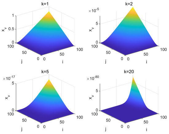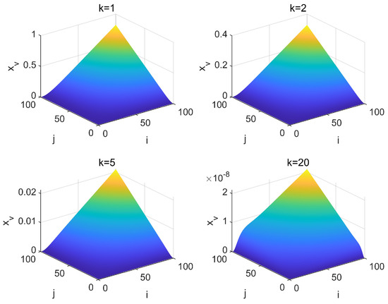 Based on the LMI criterion (10) with , and in the fastest learning mode, an optimal is obtained with and . Figure 1 and Figure 2 illustrate the vertical state and the input trajectories at different iterations, respectively. The state and the input converge to zero as the iteration number k increases. At the 20th iteration, their amplitudes attain . Compared with other conventional methods for the analysis and synthesis of 3-D systems in an iterative repetitive mode, the proposed method provides a more computationally effective tool for the controller design. For this system, conventional methods using the “lifting technique” will entail a test matrix for controller design whose matrix dimension would be multiples of 100 if we discrete the temperature distribution in space into state vectors with 100 points. This is a large computational burden. However, with the proposed method, the dimension of the test matrix for the control design is only 4, with the same number of space discretization steps. It can be easily solved within an extremely short time. The benefit is be clearer if more space discretization steps are required for accuracy in real applications. That is because the dimension would still be 4 with our method, while it would grow with the number of space discretization steps using other “lifting technique”-based schemes.