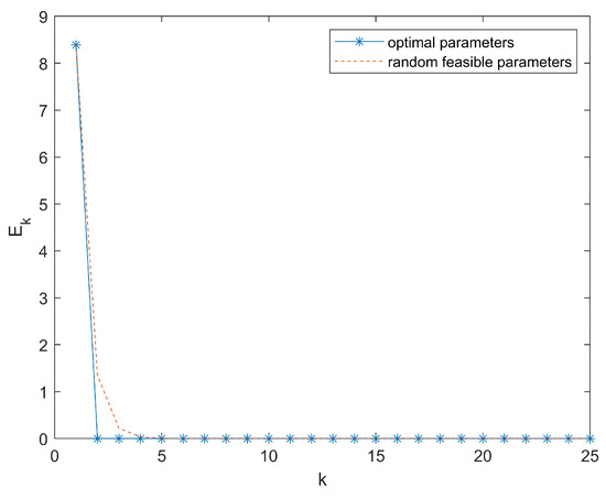 and utilizing (30), we have , which asymptotically stable according to the Lyapunov theory for discrete time systems. Thus, , and approach 0 as k goes to infinity for all i and j. □