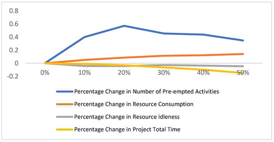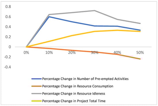 Figure 6 shows the effect of demand on the objective functions. In fact, by increasing the demand for resources, the percentage of changes is shown in the Number of Pre-empted Activities, Resource Consumption, Resource Idleness, and Project Total Time.