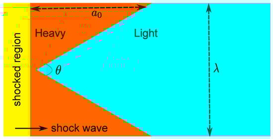Schematic diagram of the initial setup for the shock wave interaction with V-shaped heavy/light gas interface. The solid arrow illustrates the direction of shock wave propagation. and denote the vortex angle, initial interface wavelength and initial interface amplitude of the V-shaped interface.